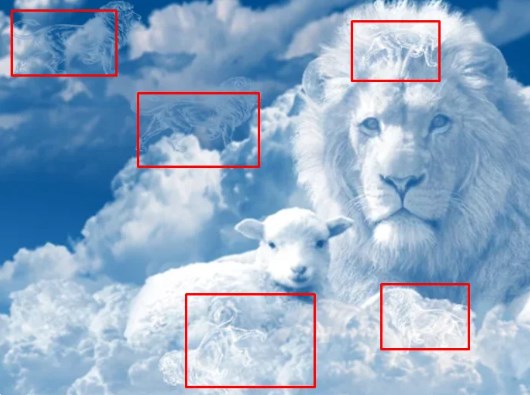 На этой картинке есть явные и не явные персонажи. Льва и овечку увидят все и без труда. Да это и просто красивая картинка, на которой можно «залипнуть». Взяли мы фрагмент из короткого минутного видео (оно будет в конце публикации).